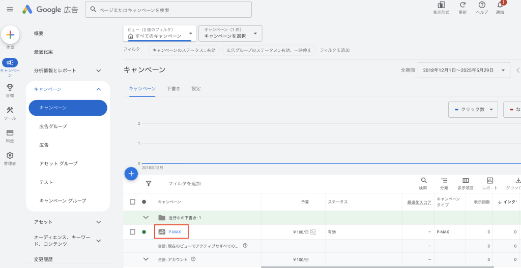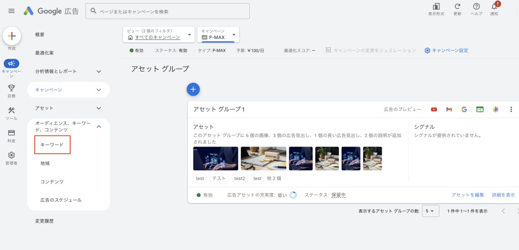 1.管理画面で該当P-MAXキャンペーンをクリック