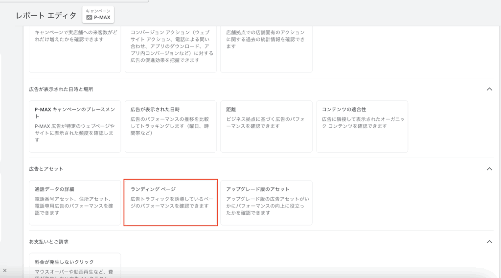3.「レポートテンプレート」から「ランディングページ」を選択