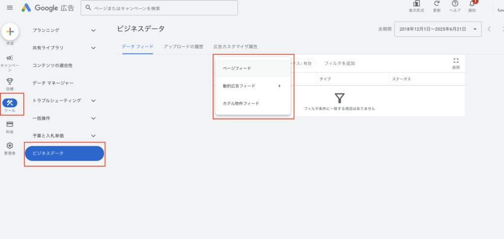 💡 画面左側の「ツール」 >「ビジネスデータ」>「データフィード」からアップロード可能