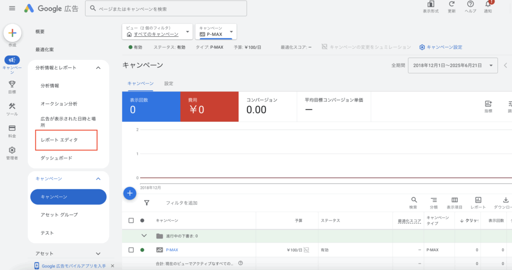 2.「分析情報とレポート」>「レポートエディタ」を選択