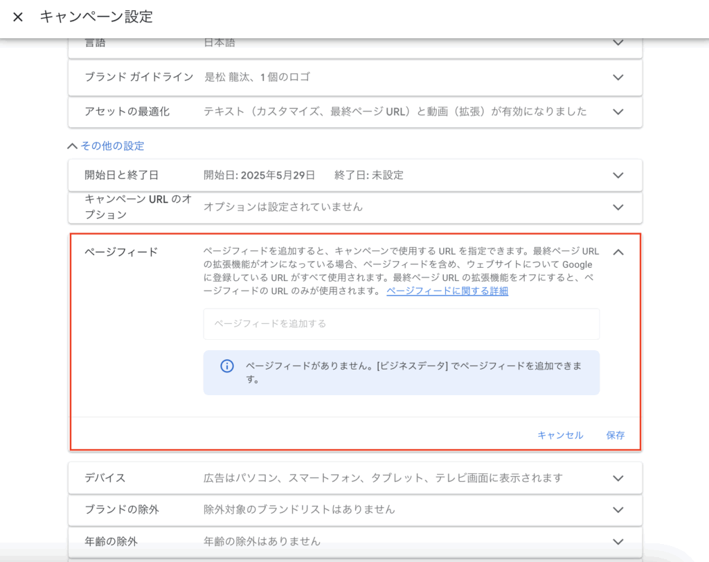 作成したページフィードの設定は「キャンペーン設定」>「ページフィード」 から可能